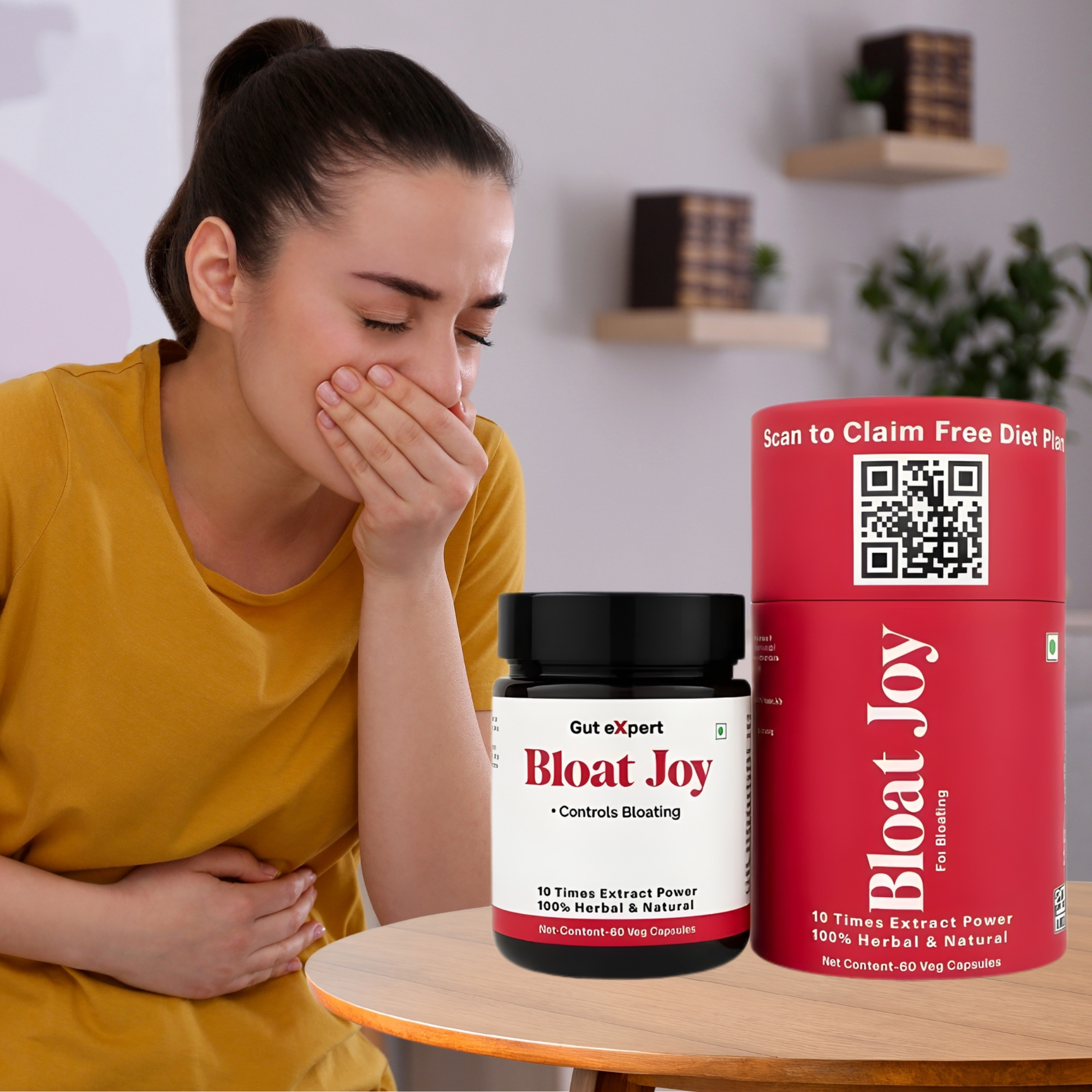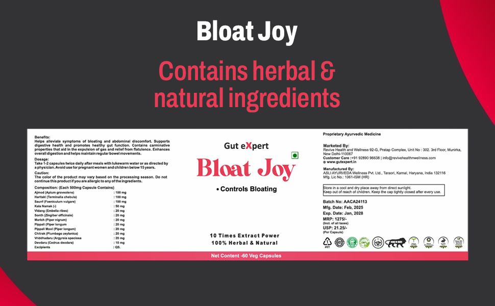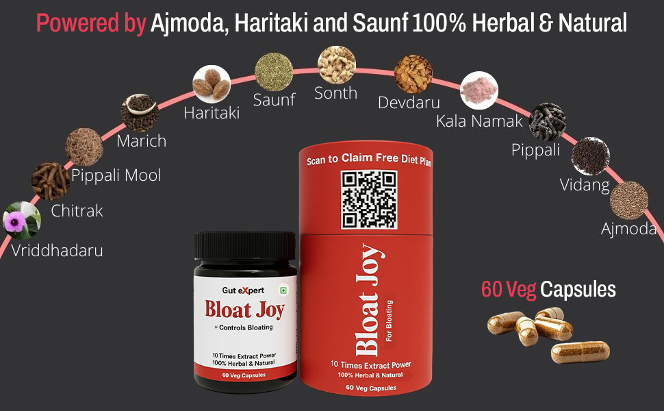 BloatJoy is a Ayurvedic 100% herbal product with carminative properties to alleviate indigestion, bloating, and gas by promoting optimal digestion and easing discomfort after meals.Its digestive benefits extend to reducing flatulence, minimizing abdominal distension and discomfort. The capusles uses extracts of herbs in ratio of 10:1 making it 10 times more effective than the powder form .