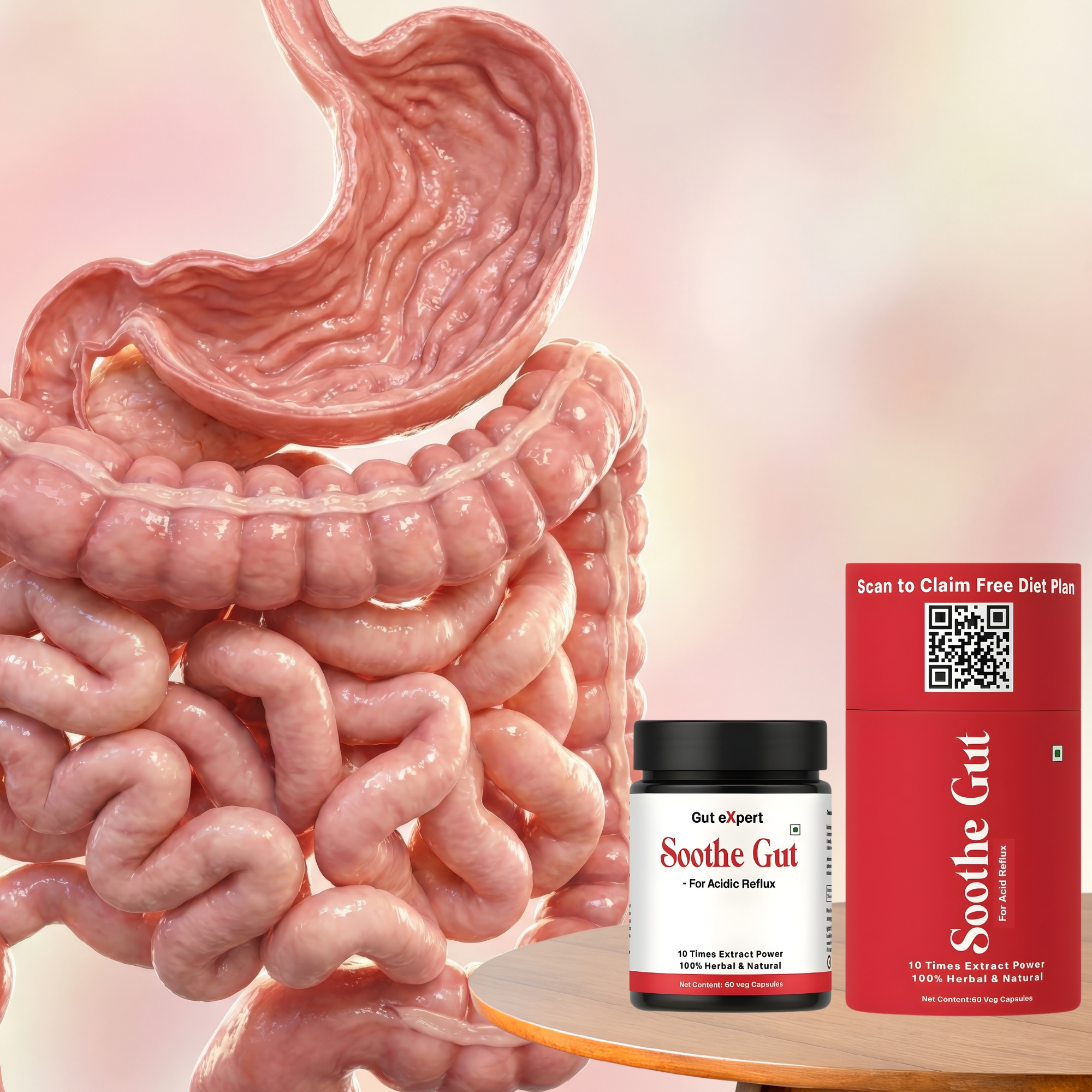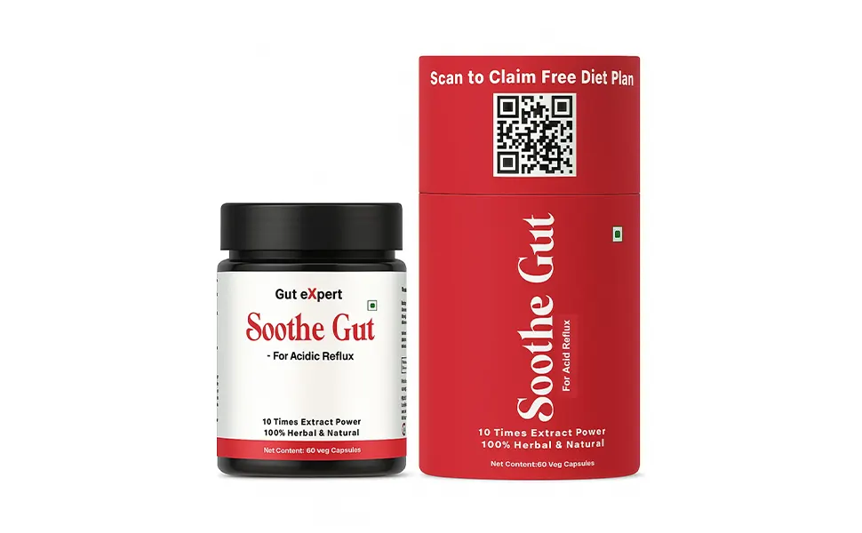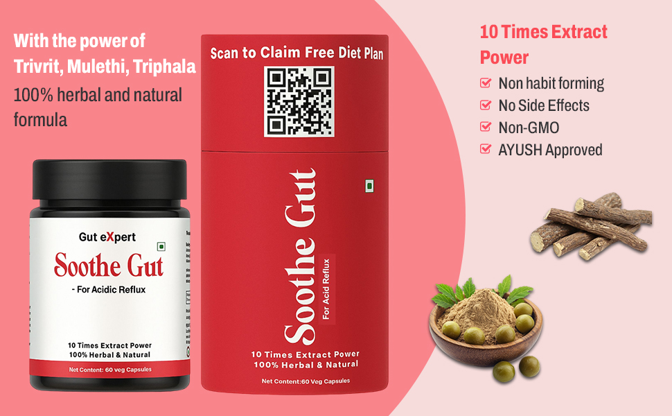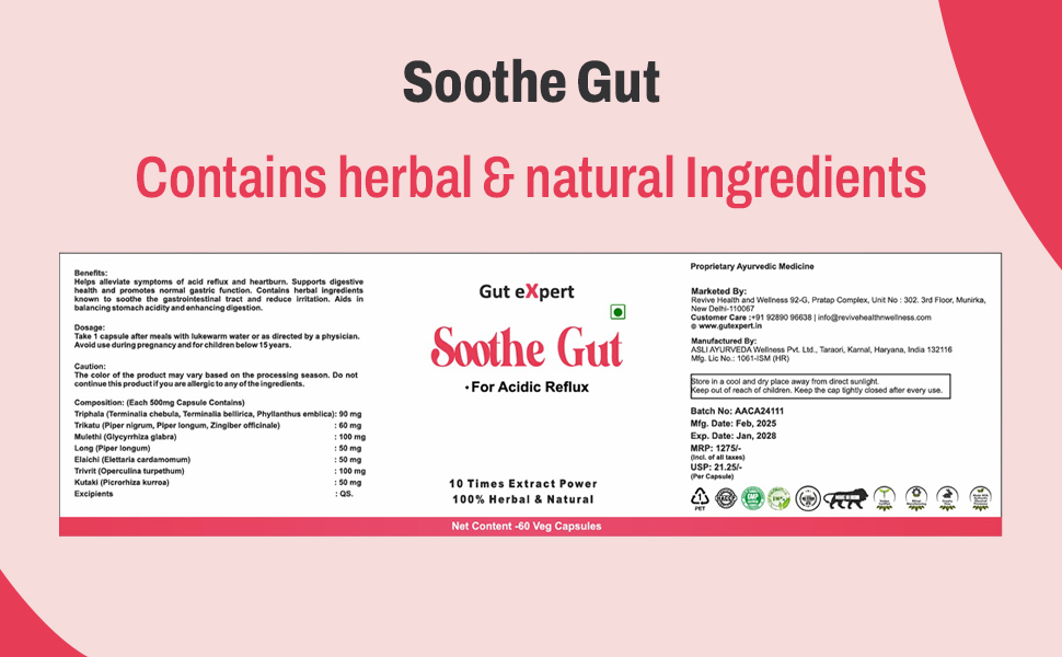 Soothe Gut is a 100% herbal Ayurvedic product used as an antacid. The capsules utilize extracts of herbs in a 10:1 ratio, making them 10 times more effective than the powder form. It has anti-inflammatory, antacid, digestive stimulant, and diuretic properties.